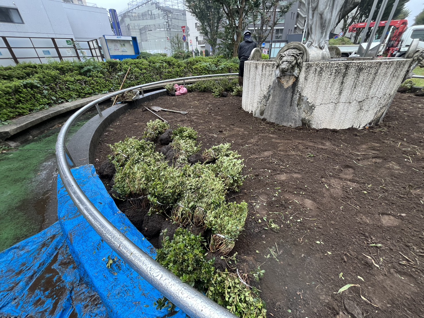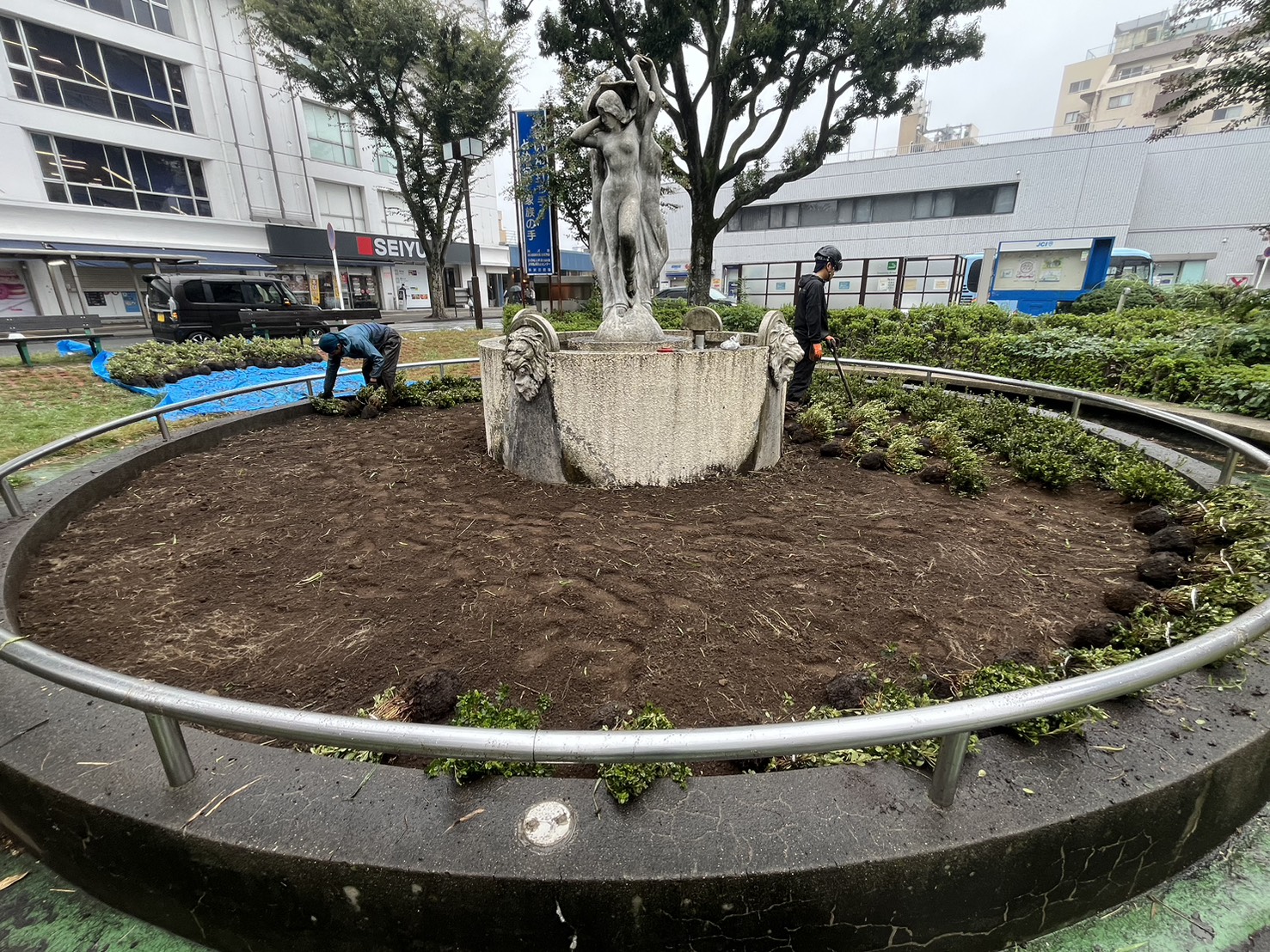 すでにお気づきの方もおられると思いますが、新所沢駅西口、ロータリー内広場の旧噴水に植栽が植えられ、綺麗に整備されました!