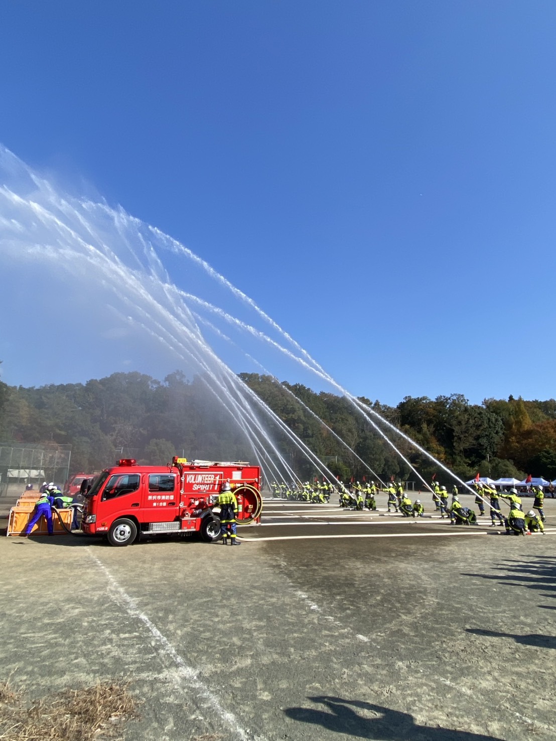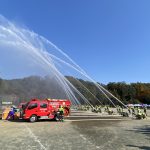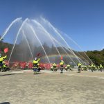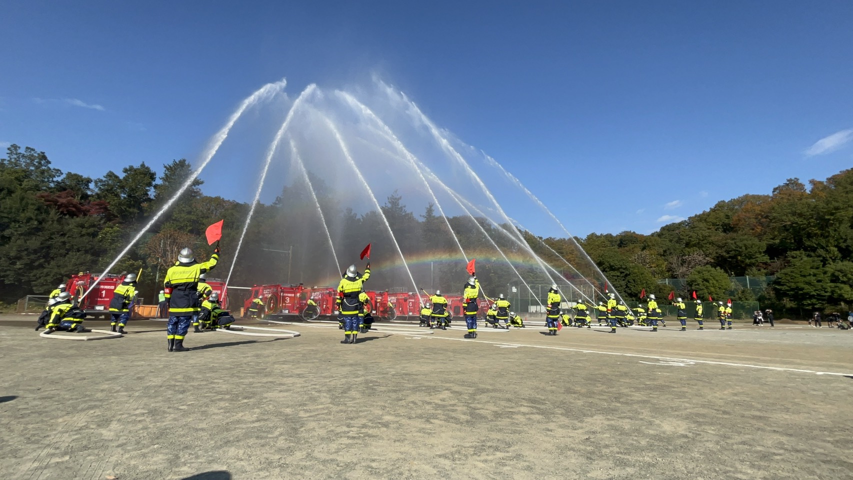 特別点検は、毎年11月に実施され、消防団の部隊行動や訓練成果について市長からの点検を受けるものです。プログラムの最後に行われる一斉放水では綺麗な虹が現れました。