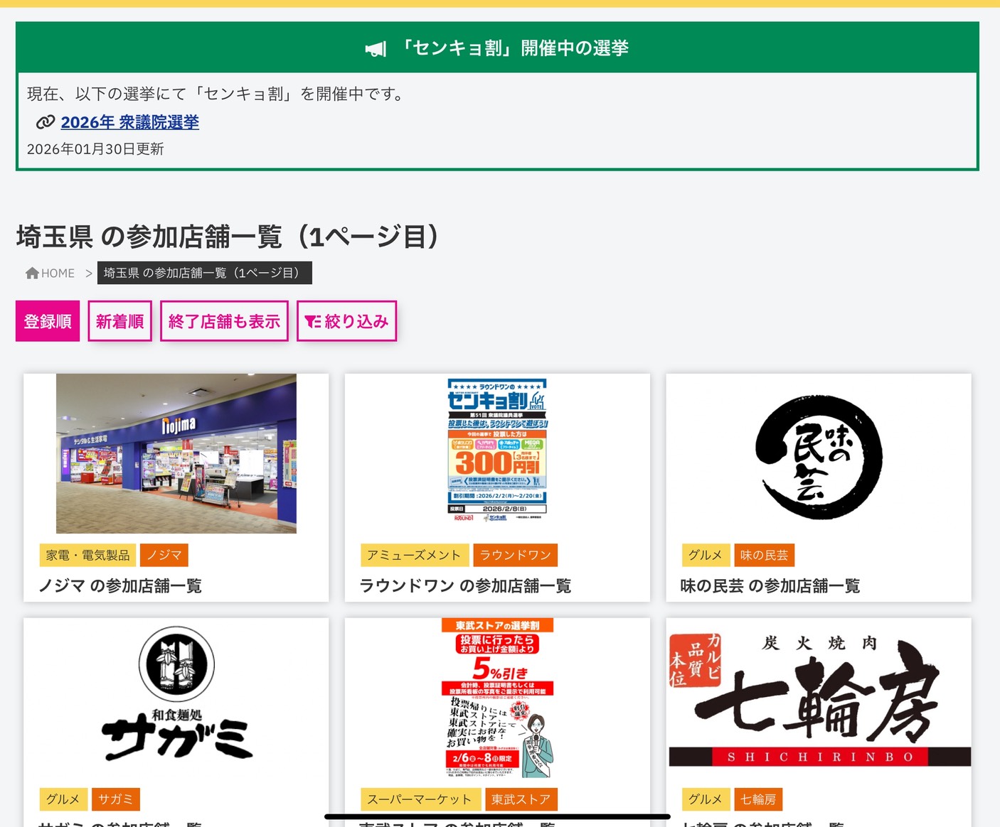 投票率向上の啓発として色々な店舗のご協力のもと、対象店舗での割引やサービスを受けられます。「センキョ割り」を行なっている店舗のまとめサイトがあり埼玉県版も見ることができました。